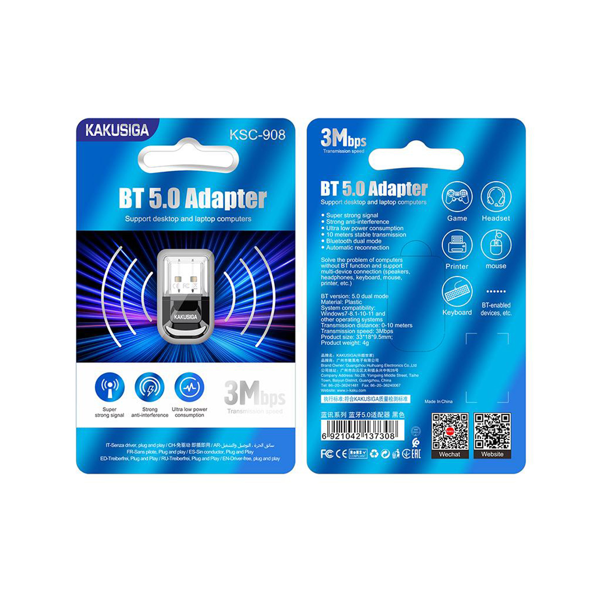 2. Bluetooth version: 5.0 dual-mode; Solve the problem of computer not having Bluetooth function, support multiple device connections (speakers, headphones, keyboard and mouse, printers, etc.)
